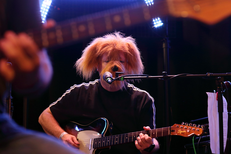 Want ondanks het serieuze en gefocuste musiceren is er zeker ook veel ruimte voor luchtigheid. Curieus is het bij enkele nummers op de achtergrond aantreden van een vierde bandlid met hondenmasker dat verwijst naar de afbeelding op de hoes van het nieuwe album. Tussen de nummers door geven de bandleden regelmatig blijk van een bijtend ironisch gevoel voor humor, zowel onderling als naar het publiek toe. Barrow meldt bijvoorbeeld dat ze het nieuwe album in zijn geheel gaan spelen, “whether you like it or not”, en hij oppert dat je even bij de bar wat anders kunt gaan doen tot de andere nummers aan de beurt zijn, of blijven staan en op deze wilde rit meegaan. Later vraagt hij aan de mensen op het balkon of ze de kale plekjes van de bandleden kunnen zien. Tot veel hilariteit leidt het ook wanneer Barrow bij het bedankje van voorprogramma Litronix meldt dat Beak> niet gelooft in het betalen van muzikanten, en dat men dus wel straks wat merchandise moet aanschaffen. Bij het applaus dat volgt sneert Fuller sarcastisch: “Jullie hebben zojuist geklapt voor het niet betalen van muzikanten.”