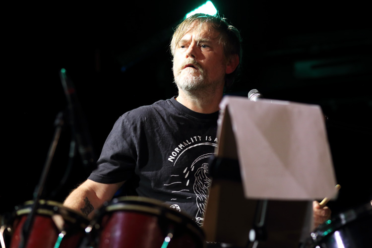 Hoewel de Oude Zaal van de Melkweg niet is uitverkocht, staat deze toch behoorlijk vol (opvallend genoeg met in de meerderheid mannen) tegen de tijd dat Beak> [overioge foto’s] het podium betreedt. Het drietal begint volgens plan met het eerste nummer van >>>>, ‘Strawberry Line’. Barrow drumt en zingt, met de teksten op papier voor zich – later zal hij dit grappend zijn “old man’s lyrics” noemen. Langzamerhand voegt Will Young zijn toetsen toe en brengt Billy Fuller met zijn bas ritme en melodie aan. Ook zorgt hij met zijn tweede stem voor een mooie harmonische samenzang. Het instrumentale samenspel met complexe drumritmes en een meanderende baslijn, neemt toe in volume en intensiteit, om naar het einde toe weer tot rust te komen.